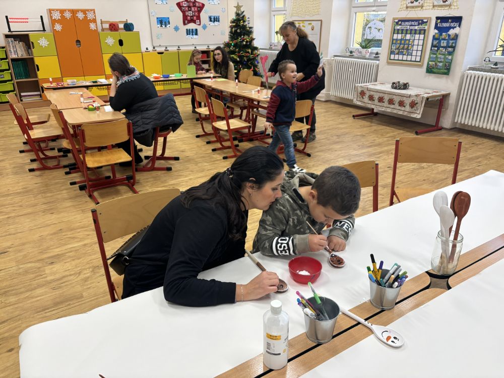 No a v neposlední řadě se ve třídě „prvňáčků“ malovali obličeje vařečkám alá perníček a sněhuláček. I pro menší děti bylo připraveno tvořeníčko v podobě přáníčka a sněhuláčka.