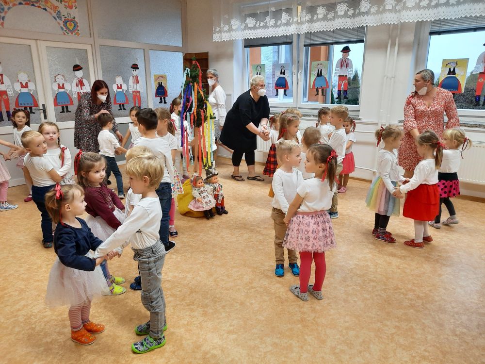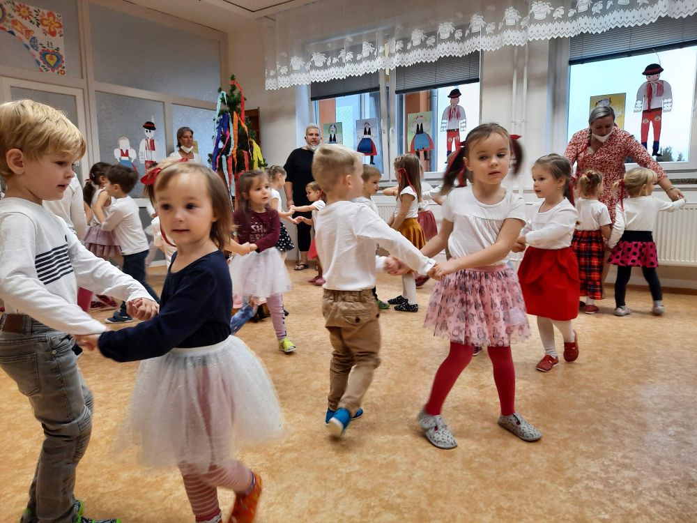Za velké podpory paní ředitelky Mgr. Sylvie Foltýnové, kreativity všech zaměstnankyň mateřské školy a folklórního nadšení paní učitelky Jany Osičkové, se to podařilo. Rodiče byli úžasní, podstoupili vstupní podmínky, usadili se a čekali na „školičkovou chasu“. V krásně vyzdobené školní jídelně v duchu tradic děti předvedly lidové písničky, verbuňk, vrtěnů a závěrečný tanec s rodiči. Na konci příjemná atmosféra, káva pro rodiče, sladký perník k chuti, povídání a veselení dětí vytvořilo pocit, že jsme všichni „pod doopravdicků májů“. Můžeme s hrdostí říct, že se to podařilo.