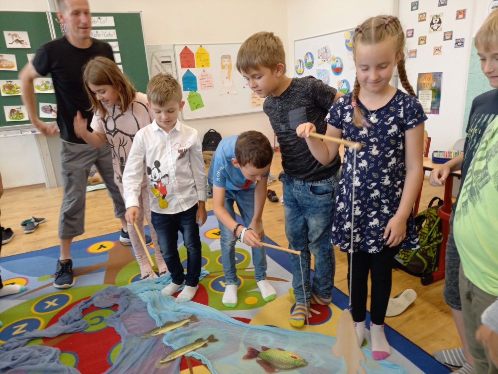 Odměnou byly didaktické hry na závěr. V první "Na rybáře" si žáci pomocí látek vytvořili na podlaze vodu a do ní lektor vložil různé druhy ryb, které žáci měli pojmenovat a pokusit se je chytit na udičku. Ve druhé hře dostala skupina na kartičce napsanou přírodninu, kterou měla hádajícímu jednotlivci předvést pantomimou. Žáci si v této části rozšířili své znalosti, ale užili si i spoustu zábavy.