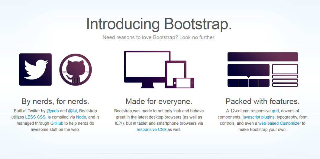 Bootstrap also provides styles for common HTML elements like typography, code, tables, forms, and buttons. It also includes Glyphicons, a great little icon set, as well as the Font Awesome icon set for even more font based icons.